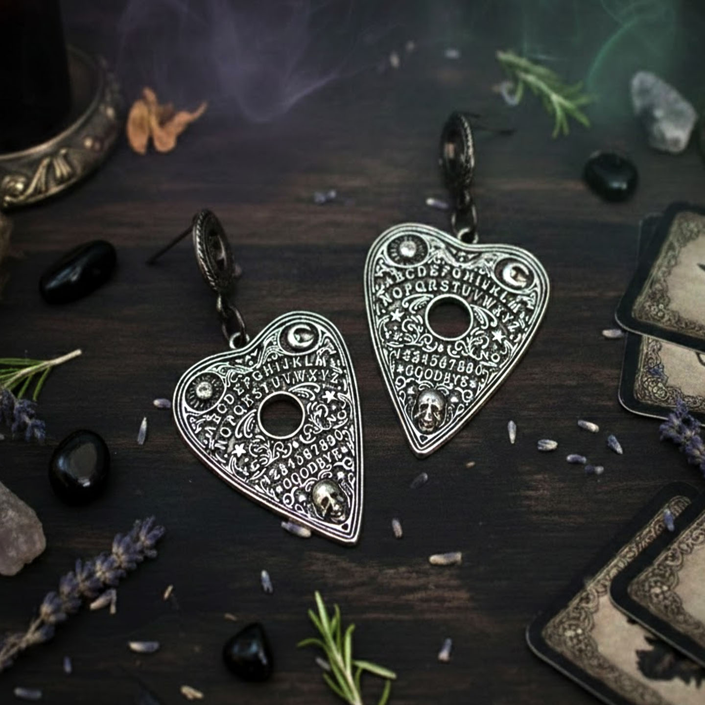 Inspirado na icônica ponteira do tabuleiro Ouija, este brinco simboliza o limiar entre o visível e o invisível, o ponto de contato entre o mundo material e os planos espirituais. A ponteira é o instrumento que revela o oculto, que responde ao chamado e que se move guiada por forças além da compreensão comum.
