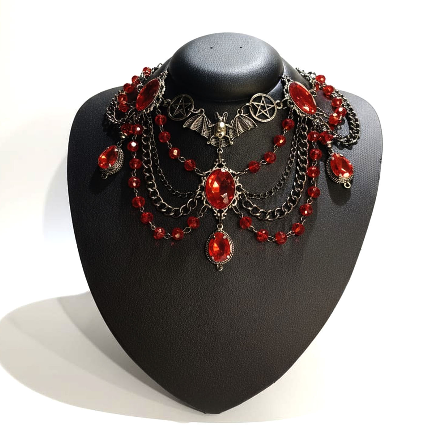 O Colar Noctis, em vermelho profundo como sangue ritual, pulsa intensidade e presença. O brilho do cristal tcheco reflete a luz como uma chama eterna na escuridão, enquanto o chaton acrílico amplia seu magnetismo visual. Uma peça feita à mão, carregada de intenção e personalidade.