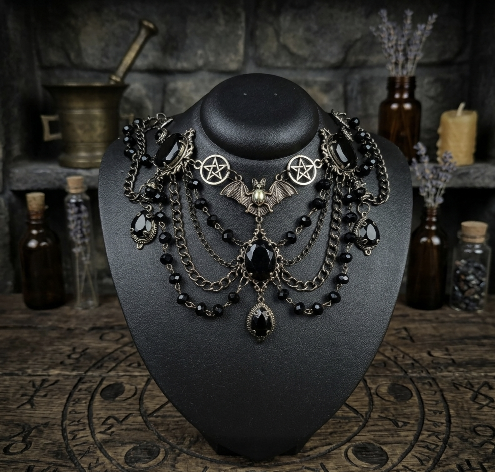 Quando o sol se põe e os véus do mundo se afinam, nasce Noctis — a joia daqueles que caminham sob a lua. Inspirado no universo vampírico, este colar carrega o símbolo do morcego, criatura da noite, guardião das sombras e mensageiro da transformação.