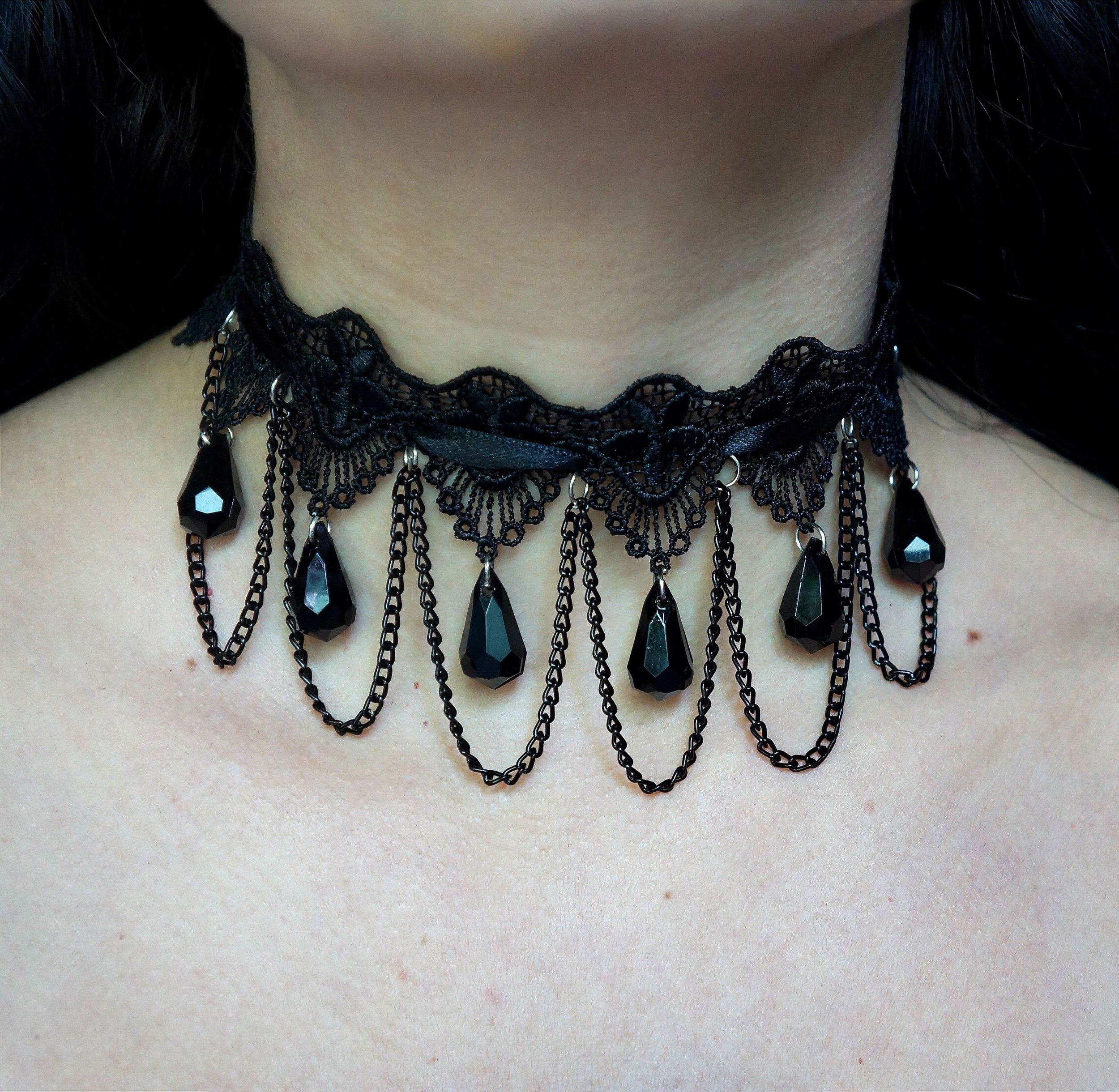 A gargantilha, chamada de choker necklace no original inglês, entrou na moda durante a Revolução Francesa, quando as mulheres passaram a usar fitas vermelhas em seus pescoços para homenagear aqueles que morreram nas guilhotinas. Em 1860, a gargantilha ficou famosa por conta da pintura “Olympia” de Manet, que mostrava uma prostituta usando apenas uma fita negra em torno do pescoço. Nessa época, usar gargantilhas poderia significar que uma mulher era prostituta ou bailarina, como podemos ver nas pinturas de Degas nas décadas de 1870 e 1880. Na década de 1880, a Princesa de Gales, Alexandra, usava gargantilhas sempre, fossem de renda, veludo ou pérolas (acredita-se que era para cobrir uma cicatriz que tinha em seu pescoço). De qualquer forma, nesse momento as gargantilhas se tornaram moda reais, e hoje são muito utilizadas em filmes, séries e outras adaptações vitorianas e eduardianas, além de fantasias steampunk.