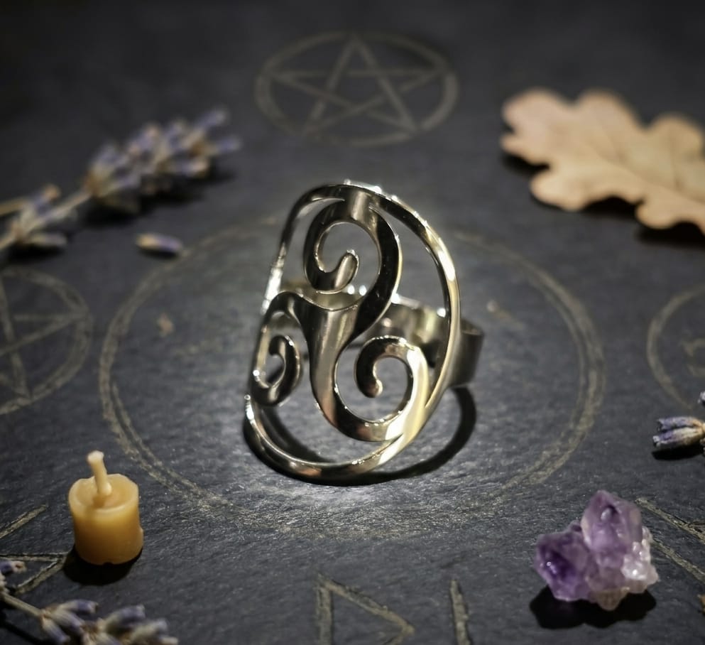 Seu design traz as três espirais em fluxo contínuo, simbolizando transformação, crescimento e o eterno movimento do universo. Uma peça ideal para quem busca expressar espiritualidade, proteção e harmonia através dos detalhes.