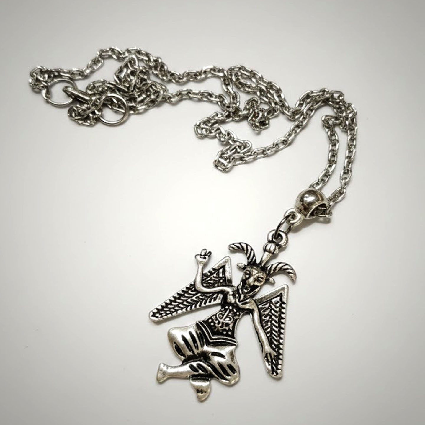 Confeccionado em zamak, este pingente possui presença marcante e acabamento detalhado, acompanhado de corrente sortida. Mais do que um adorno, é um talismã para aqueles que trilham o caminho do conhecimento, da força interior e da verdadeira iniciação.